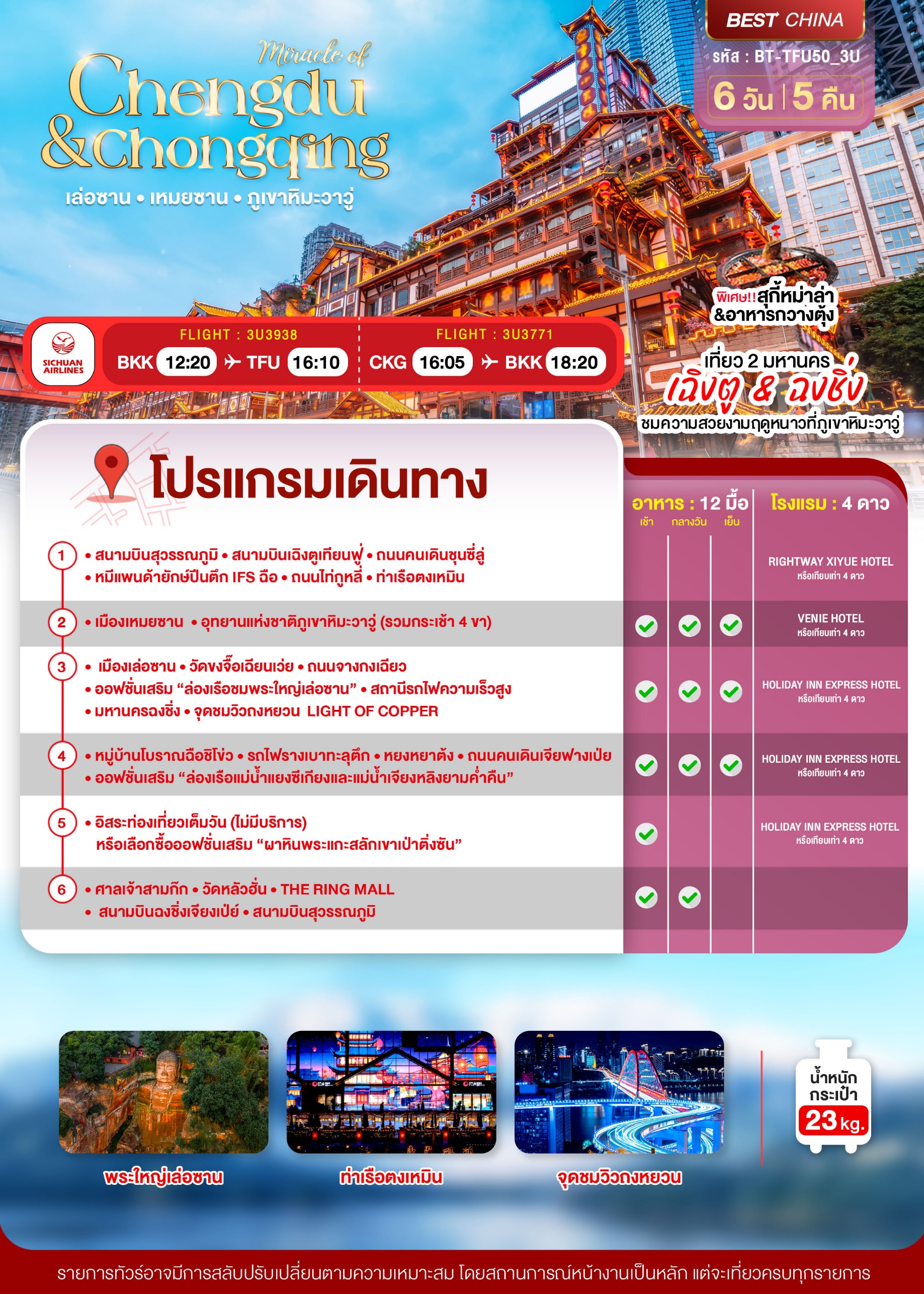 ทัวร์จีน เฉิงตู ฉงชิ่ง เล่อซาน เหมยซาน ภูเขาหิมะวาวู่ 6 วัน 5 คืน บิน3U เดินทาง พ.ย.68-มี.ค.69 ราคาเริ่ม 20,999 บาท