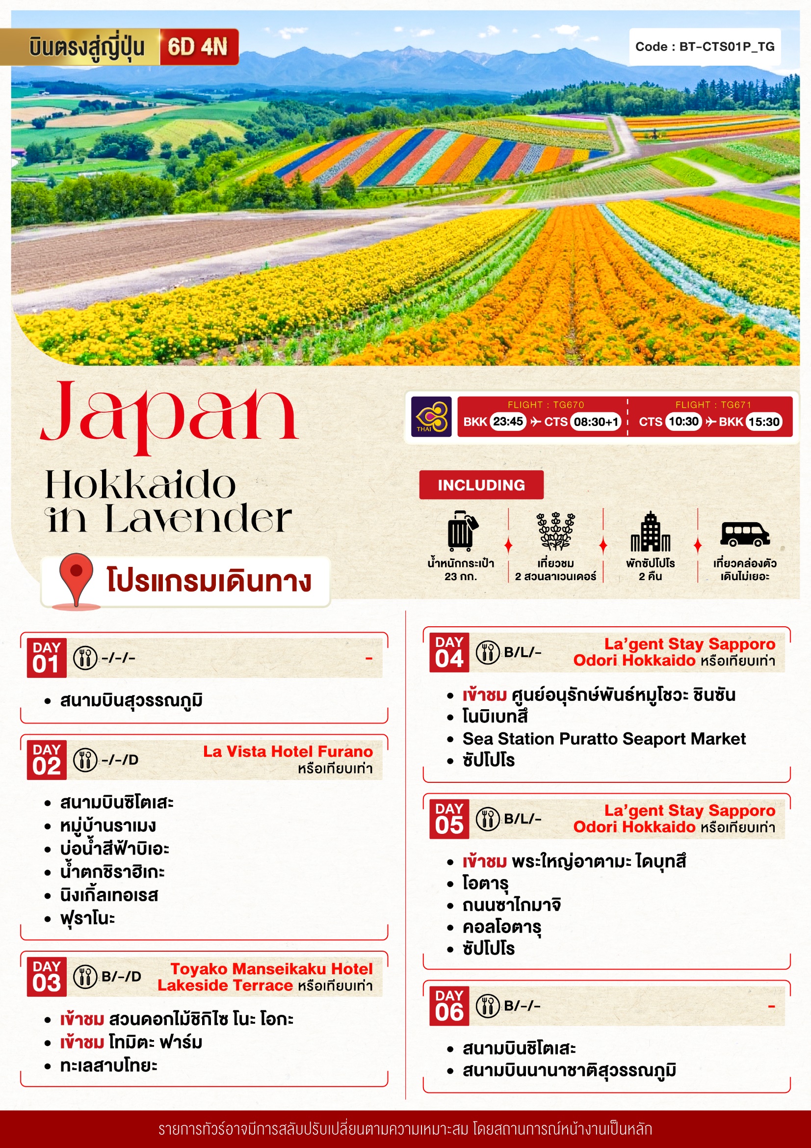 ทัวร์ญี่ปุ่น HOKKAIDO อาซาฮิกาว่า โทมิตะ โทยะ ซัปโปโร ชม 2 สวนดอกไม้อลังการ 6 วัน 4 คืน บินTG เดินทาง ก.ค. 69 ราคา 99,999 บาท