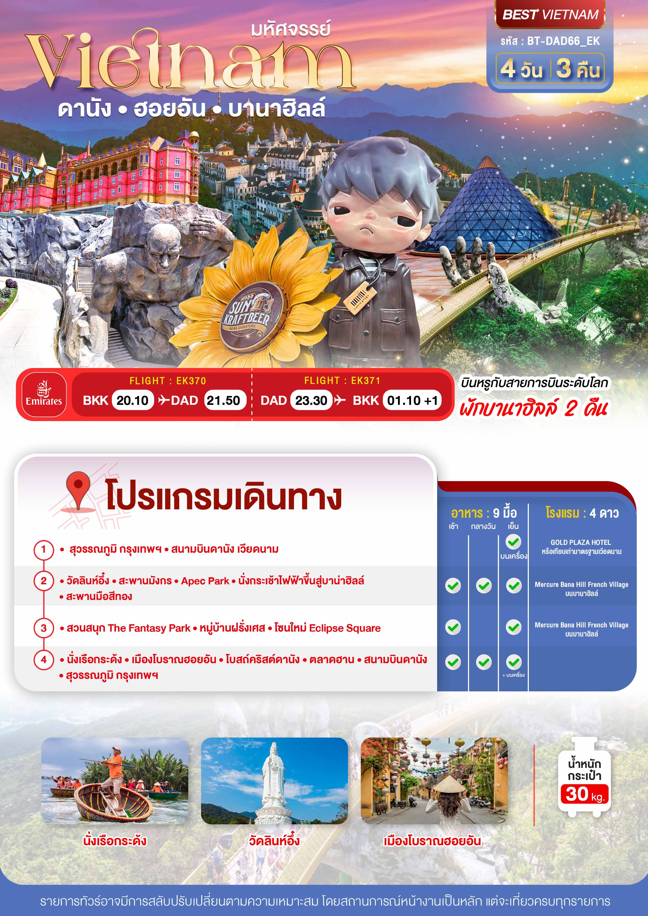 ทัวร์เวียดนามกลาง ดานัง ฮอยอัน พักบาน่าฮิลล์ 2 คืน (เทศกาลสงกรานต์) 4 วัน 3 คืน บิน EK ราคาเพียง 22,999 บาท
