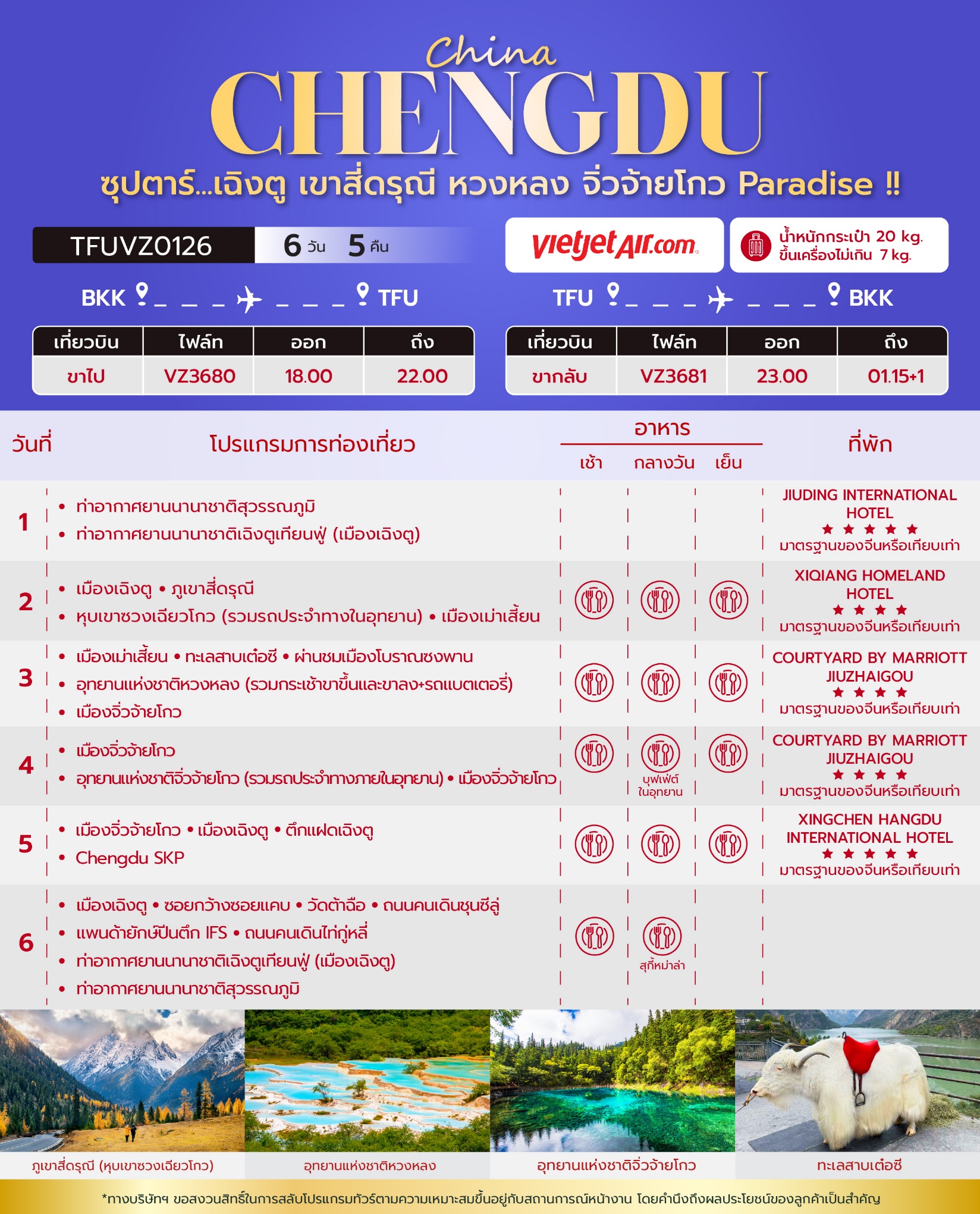 ทัวร์จีน เฉิงตู เขาสี่ดรุณี หวงหลง จิ่วจ้ายโกว 6 วัน 5 คืน บินVZ เดินทาง เม.ย.-ต.ค. 69 ราคาเริ่ม 19,888 บาท