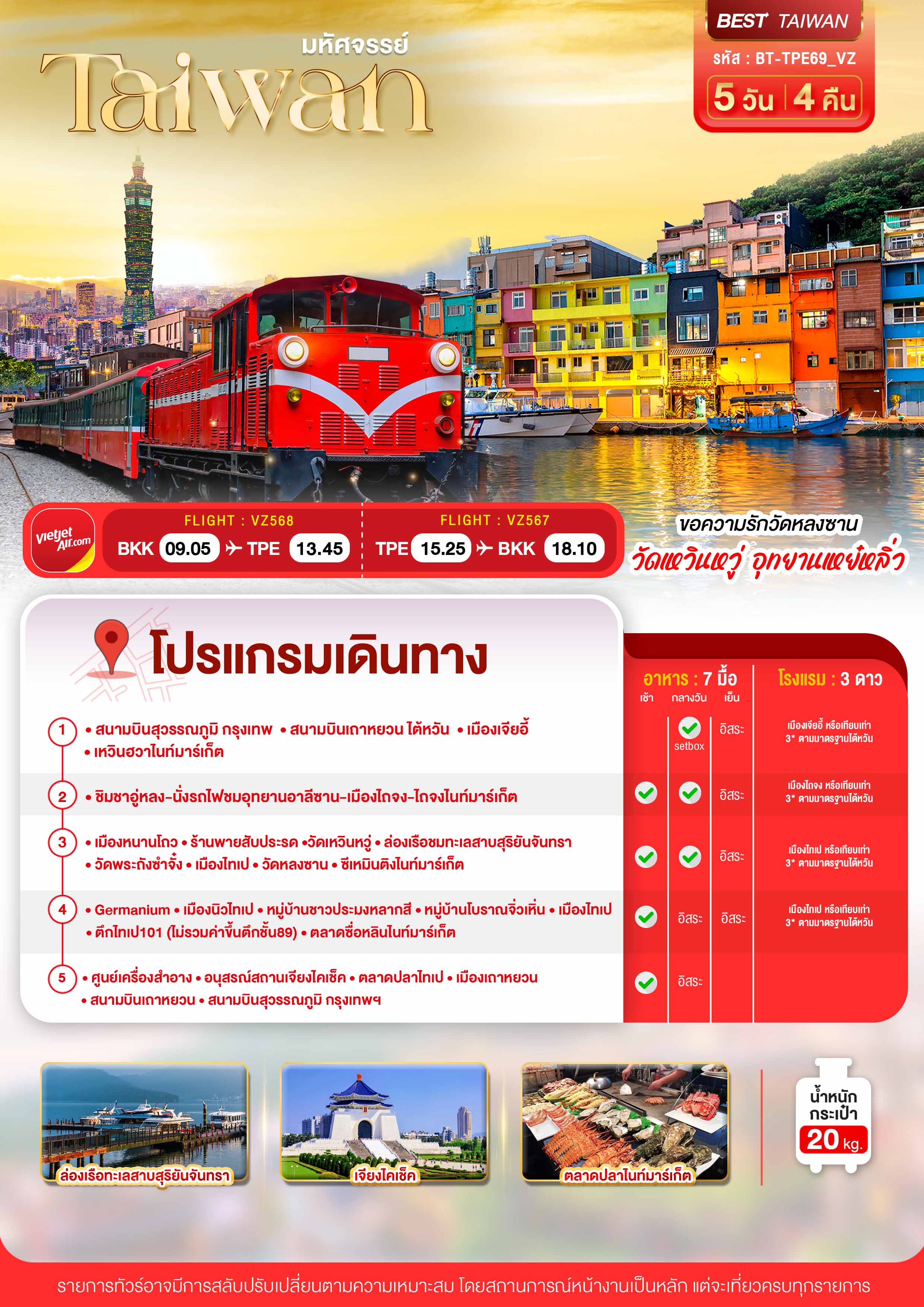 ทัวร์ไต้หวัน TAIWAN บินคุ้ม เที่ยวครบ Street Food แบบจุใจ 5 วัน 4 คืน บินVZ เดินทาง เม.ย.-ต.ค. 69 ราคาเริ่ม 17,999 บาท