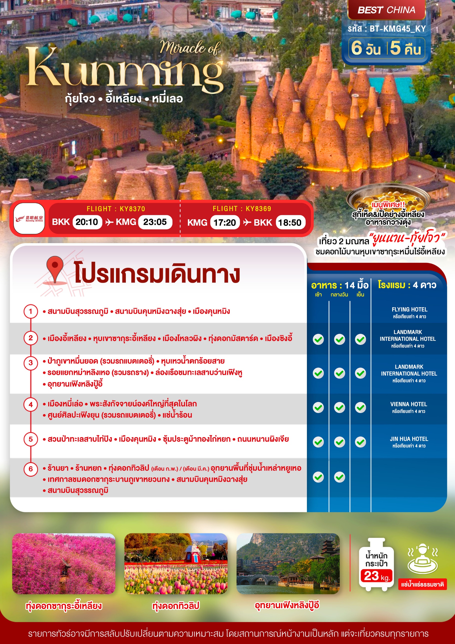 ทัวร์คุนหมิง กุ้ยโจว อี้เหลียง หมี่เลอ 6 วัน 5 คืน บินKY เดินทาง ก.พ. มี.ค. 69 ราคาเริ่ม 20,999 บาท