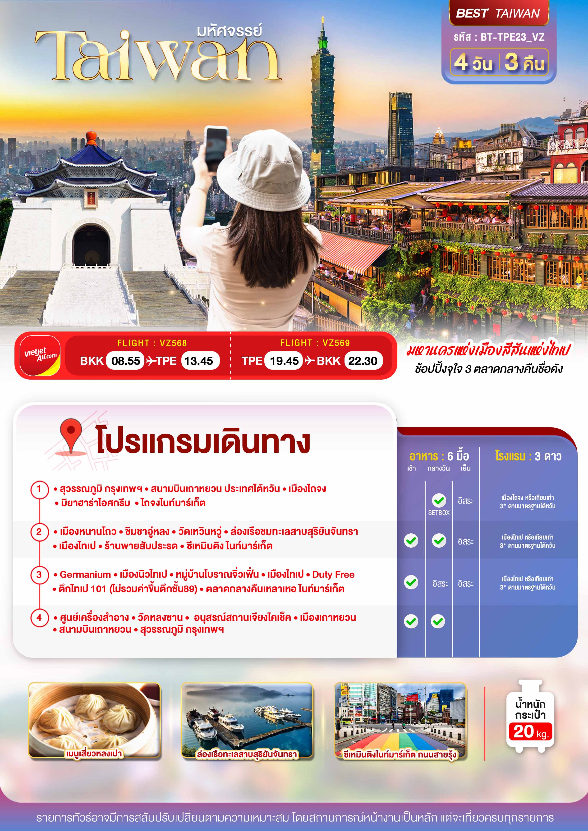 ทัวร์ไต้หวัน TAIPEI มหานครแห่งเมืองสีสัน อิสระช้อปปิ้งแบบจุใจ 4 วัน 3 คืน บินVZ เดินทาง เม.ย.-ต.ค. 69 ราคาเริ่ม 13,999 บาท