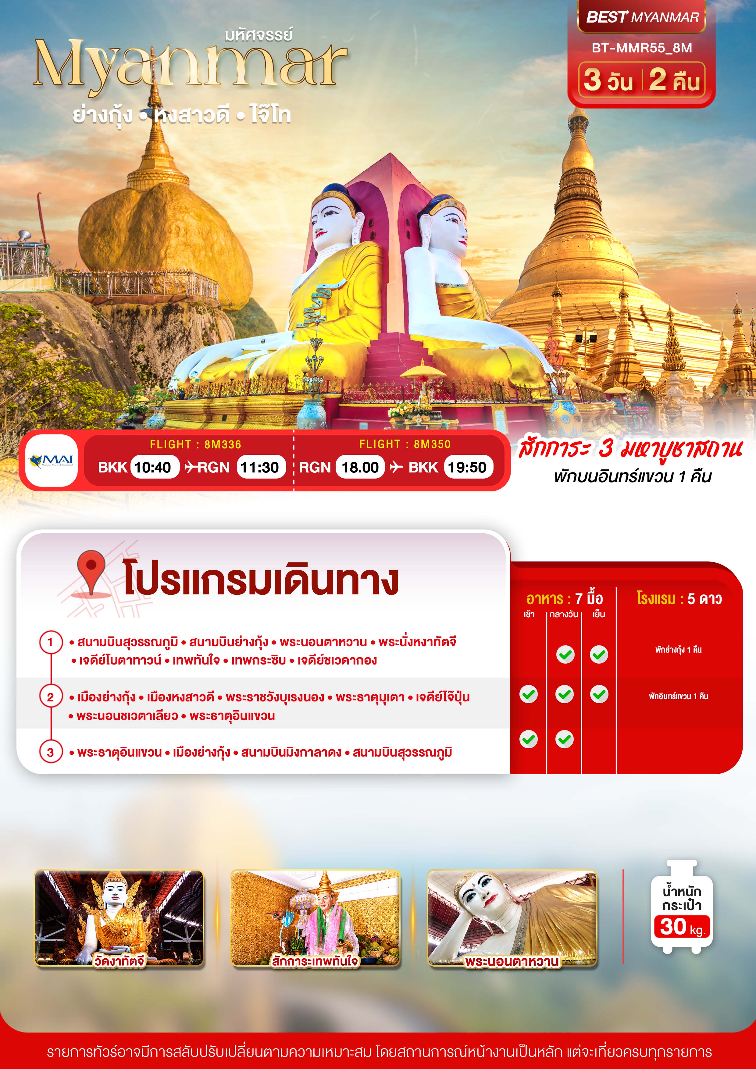 ทัวร์พม่า MYANMAR ย่างกุ้ง หงสา อินแขวน 3 วัน 2 คืน บิน8M เดินทาง มิ.ย.-ต.ค. 69 ราคาเริ่ม 10,999 บาท
