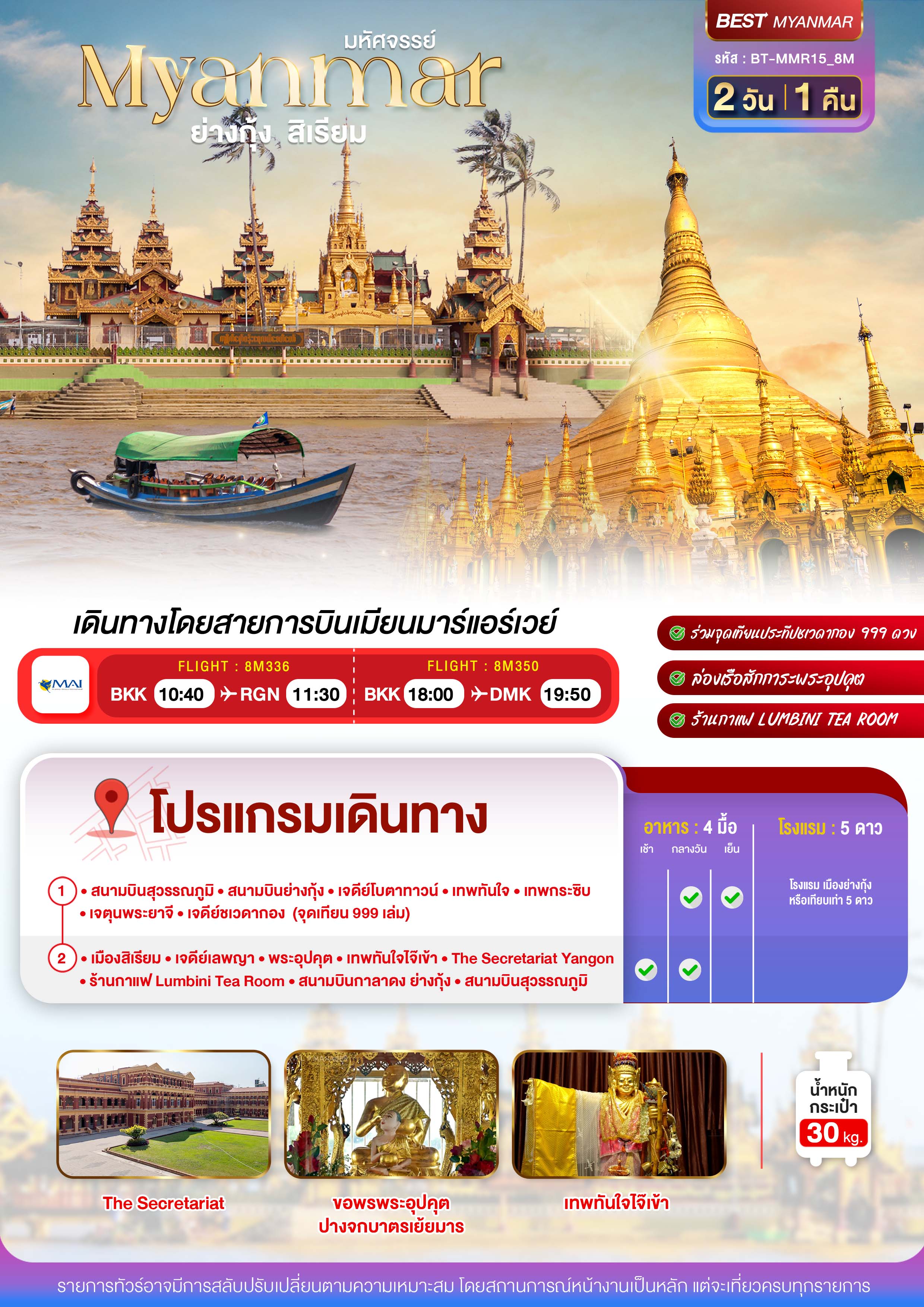 ทัวร์พม่า เมียนมาร์ ย่างกุ้ง สิเรียม ร่วมจุดเทียนประทีปชเวดากอง 999 ดวง 2 วัน 1 คืน บิน8M เดินทาง มิ.ย.-ต.ค. 69 ราคาเริ่ม 7,999 บาท