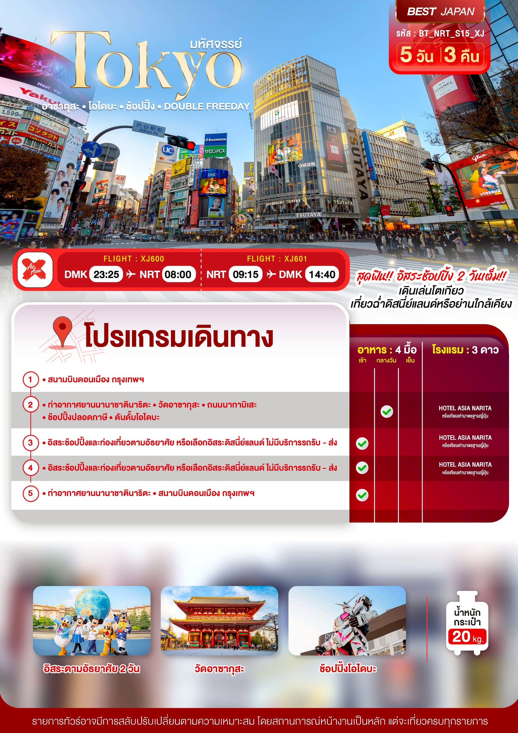 ทัวร์ญี่ปุ่น โตเกียว TOKYO อาซากุสะ โอไดบะ ช้อปปิ้ง DOUBLE FREEDAY 5 วัน 3 คืน บินXJ เดินทาง พ.ค.-ก.ย. 69 ราคาเริ่ม 18,999 บาท