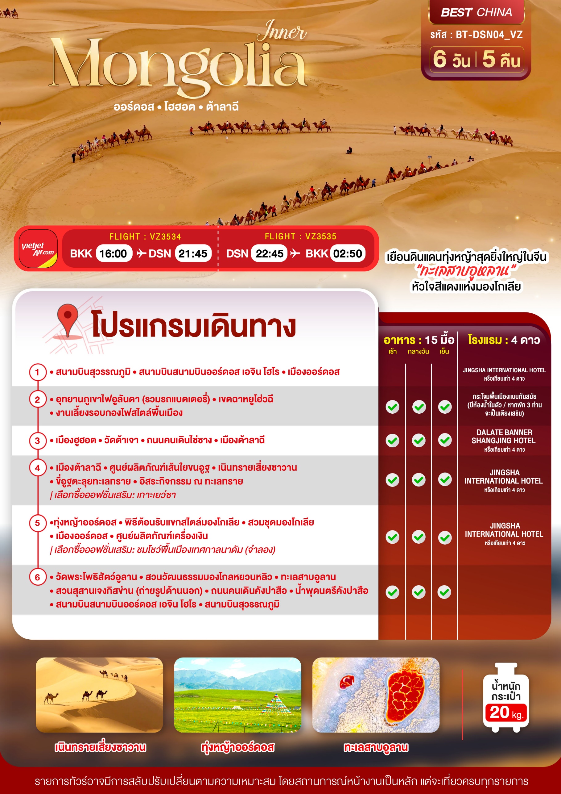 ทัวร์มองโกเลียใน ออร์ดอส ฉาหยูโฮ่วฉี ฮูฮอต ต้าลาฉี (บินตรง) 6 วัน 5 คืน บินVZ เดินทาง เม.ย.-ต.ค. 69 ราคาเริ่ม 23,999 บาท