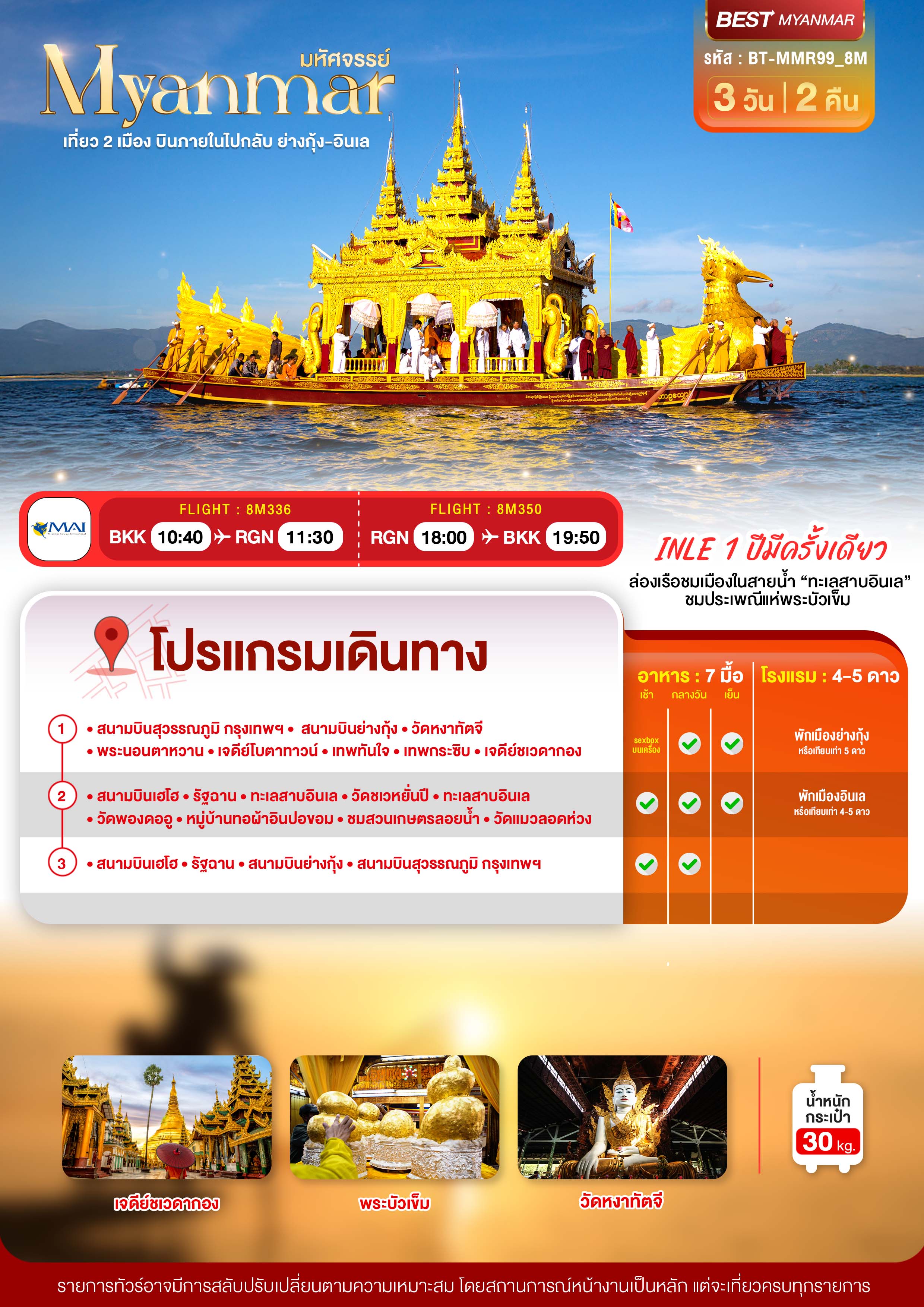 ทัวร์พม่า MYANMAR INLE 1 ปีมีครั้งเดียว เที่ยว 2 เมือง บินภายในไปกลับ ย่างกุ้ง-อินเล 3 วัน 2 คืน บิน8M เดินทาง ต.ค. 69 ราคาเริ่ม 25,999 บาท