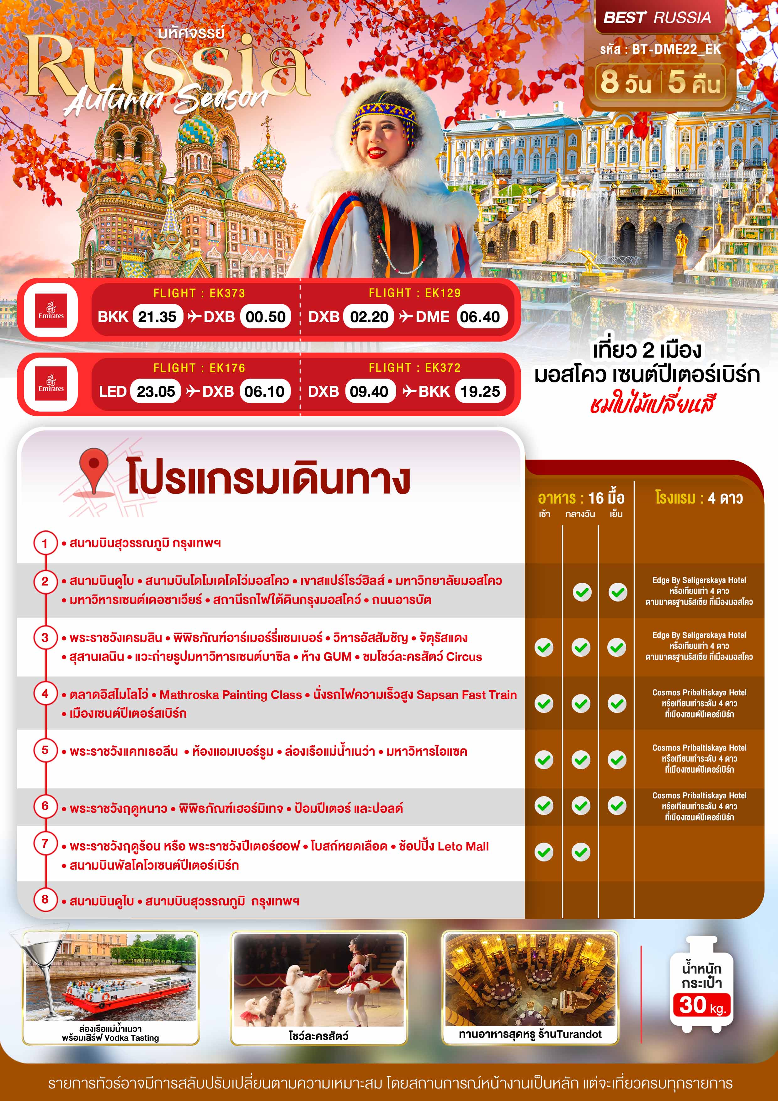 ทัวร์รัสเซีย RUSSIA มอสโคว เซนต์ปีเตอร์เบิร์ก ชมฤดูใบไม้ร่วง 8 วัน 5 คืน บินEK เดินทาง ต.ค. 69 ราคาเริ่ม 73,999 บาท