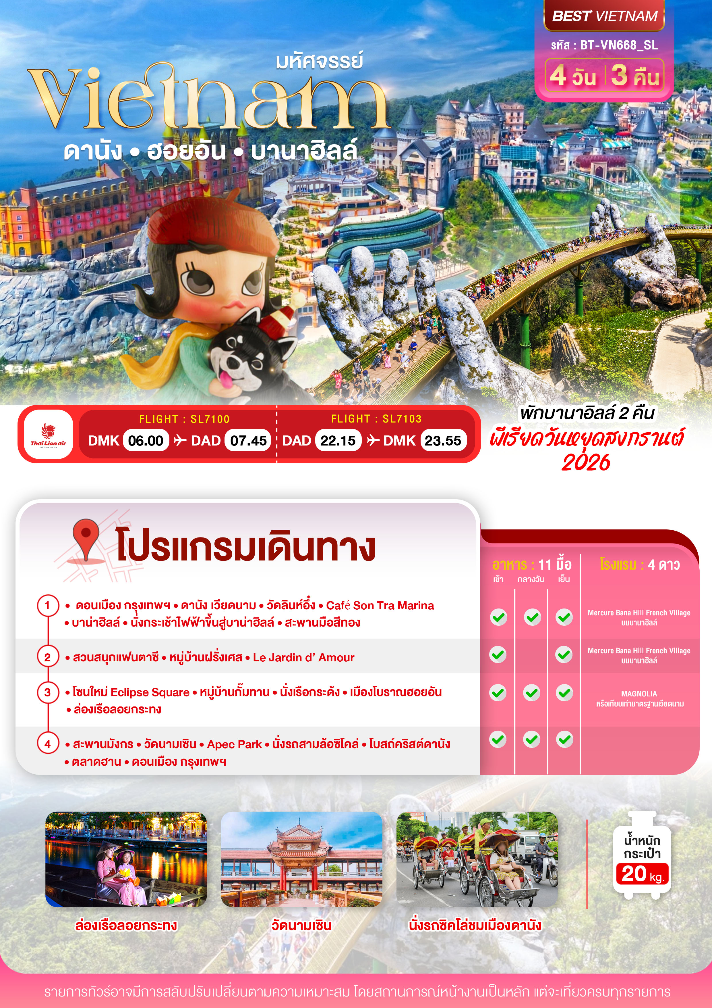 บินเหมาลำ ฉลองเทศกาลสงกรานต์ ดานัง ฮอยอัน บาน่าฮิลล์ ไม่ลงร้านช้อป (พักบานาฮิลล์ 2 คืน) 4 วัน 3 คืน พักบาน่าฮิลล์ 2 คืน + ดานัง 1 คืน นั่งกระเช้าขึ้นบาน่าฮิลล์ นั่งรถชิโคล่ สะพานมังกร เมืองโบราณฮอยอัน ล่องเรือลอยกระทงฮอยอัน นั่งเรือกระด้ง โปรแกรมนี้ไม่ลงร้านช็อป เดินทาง สงกรานต์ 12-15 เม.ย. 69 ราคา 22,999.- บาท