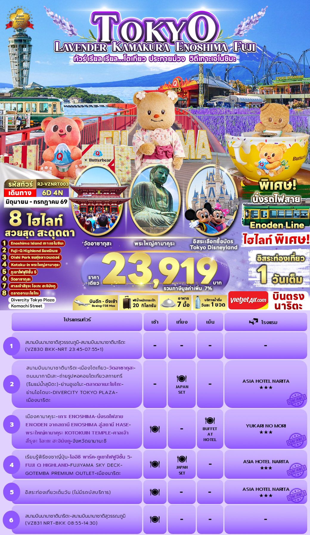 ทัวร์ญี่ปุ่น โตเกียว TOKYO KAMAKURA ENOSHIMA FUJI 6D4N บินVZ เดินทาง มิ.ย.-ก.ค. 69 ราคาเดียว 23,919 .-บาท