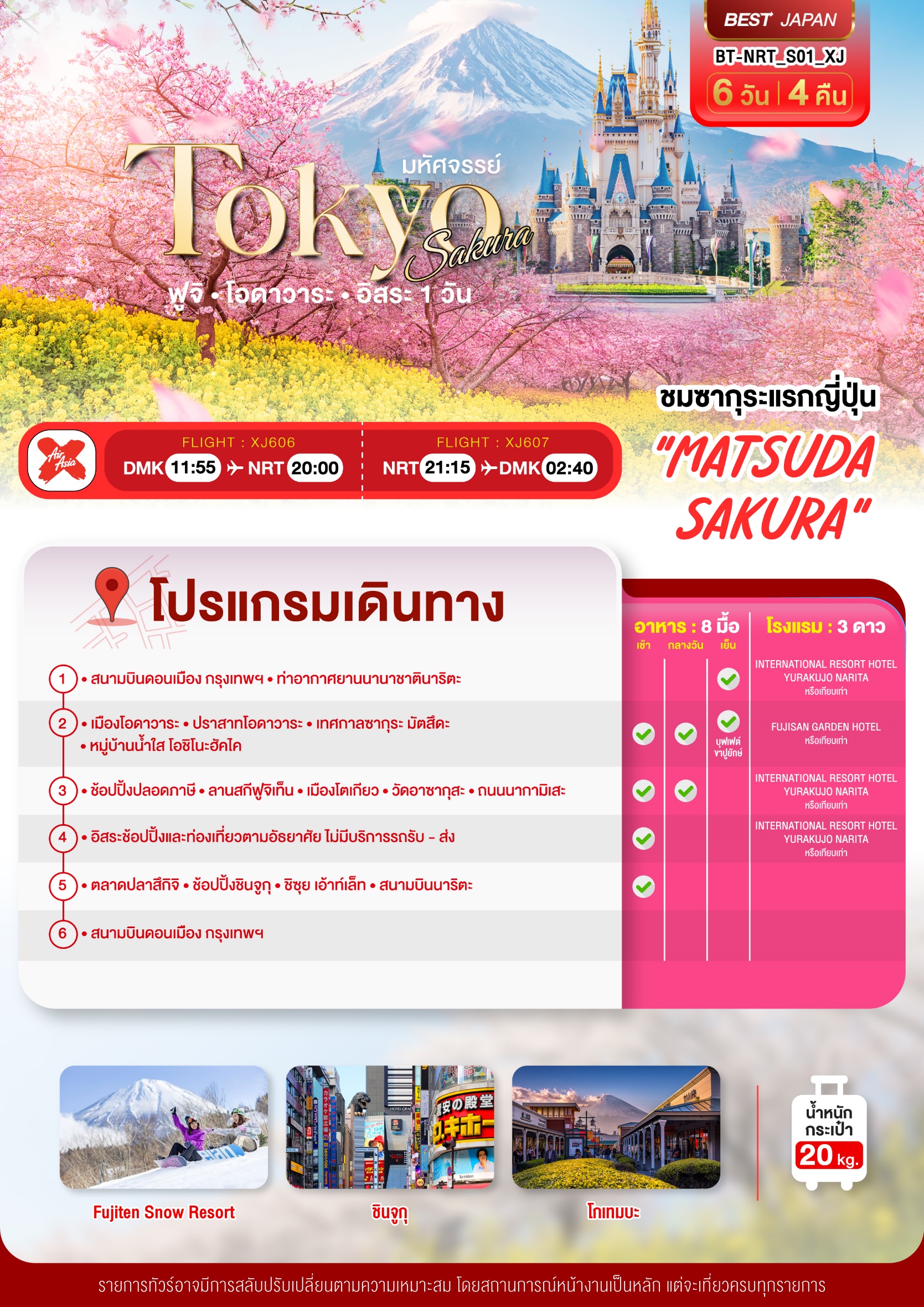 ทัวร์ญี่ปุ่น โตเกียว TOKYO SAKURA ฟูจิ โอดาวาระ อิสระ 1 วัน 6 วัน 4 คืน บินXJ เดินทาง ก.พ.-มี.ค. 69  ราคาเริ่ม  42,999 บาท