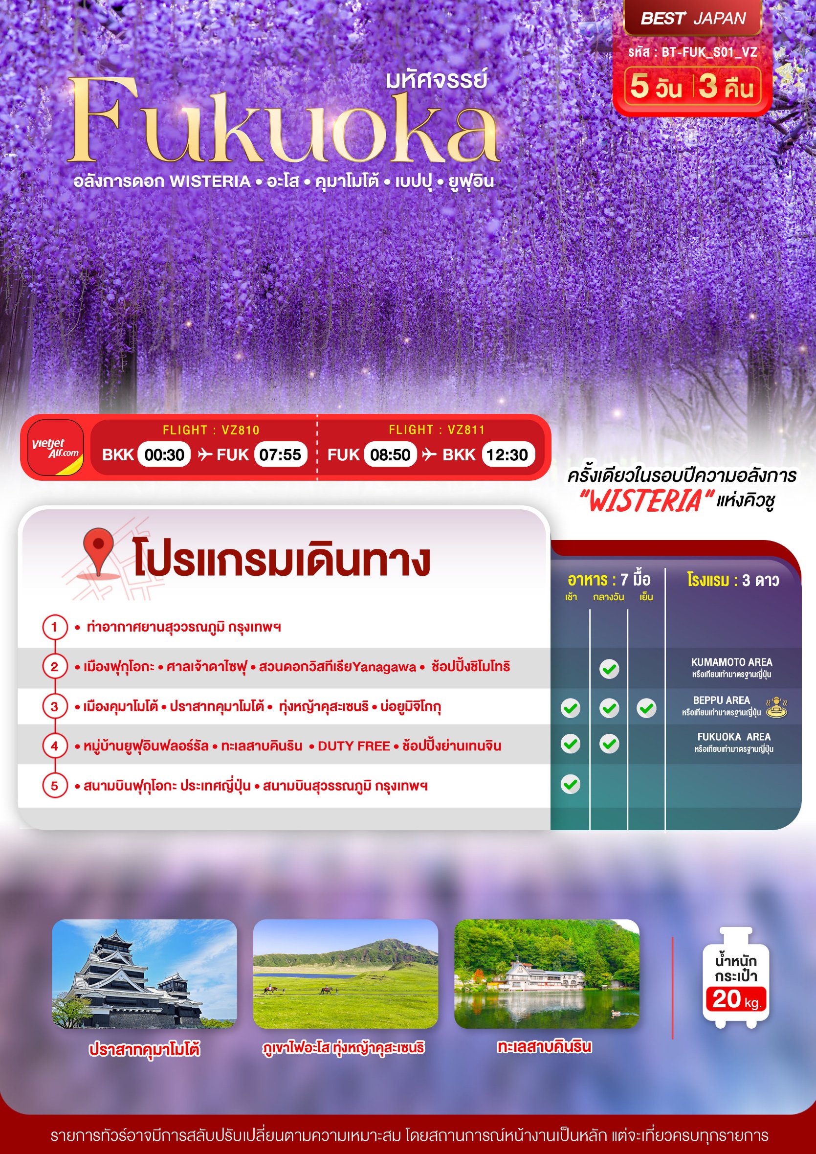 ทัวร์ญี่ปุ่น ฟุกุโอกะ FUKUOKA อลังการดอก Wisteria อะโส คุมาโมโต้ เบปปุ ยูฟุอิน 5 วัน 3 คืน บินVZ เดินทาง 22 – 26 เม.ย. 69 ราคา  33,999 บาท