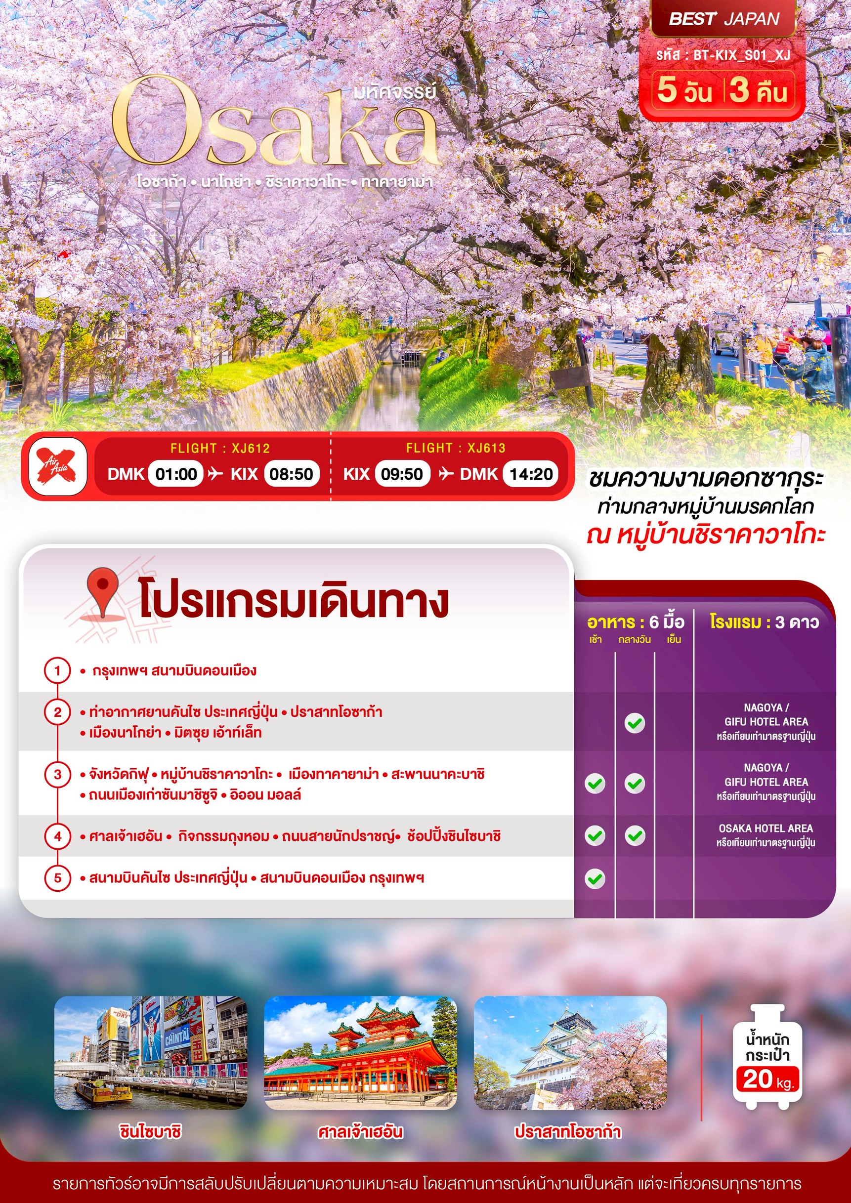 ทัวร์ญี่ปุ่น โอซาก้า OSAKA นาโกย่า ชิราคาวาโกะ ทาคายาม่า 5 วัน 3 คืน บินXJ เดินทาง เม.ย. 69 ราคาเริ่ม 34,999 บาท