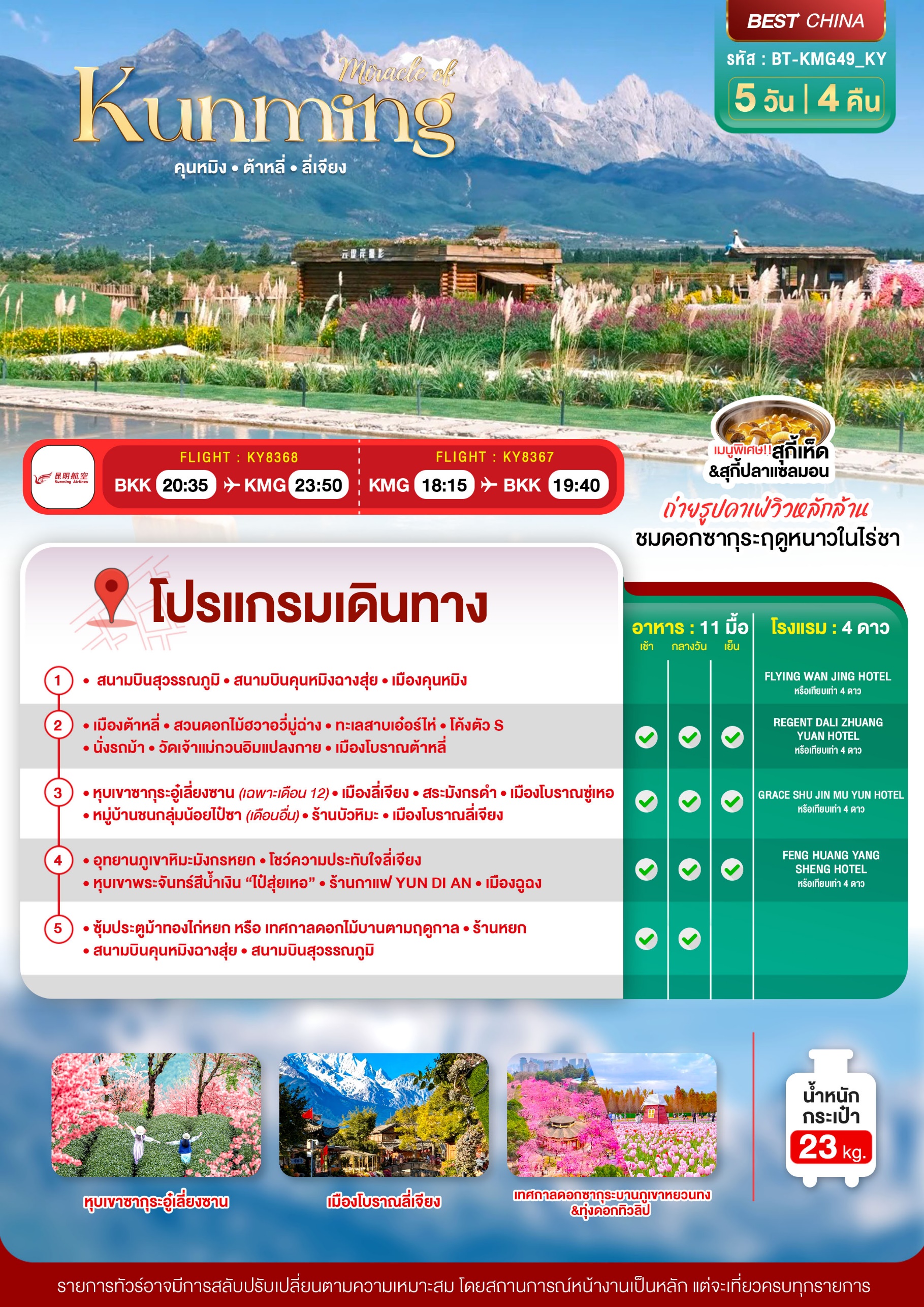 ทัวร์คุนหมิง ต้าหลี่ ลี่เจียง ภูเขาหิมะมังกรหยก 5 วัน 4 คืน บินKY เดินทาง ธ.ค.68-มี.ค.69 ราคาเริ่ม 16,999 บาท
