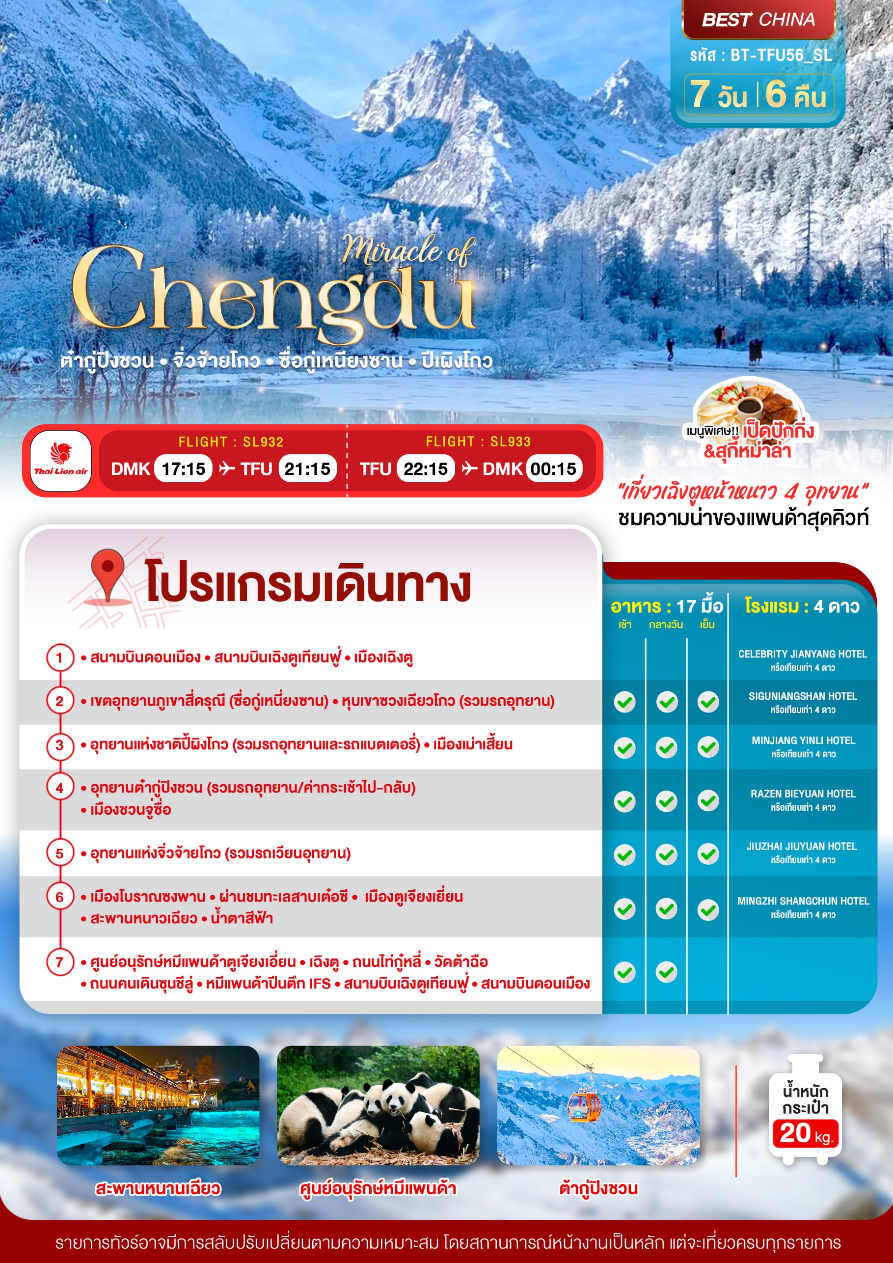 ทัวร์จีน เฉิงตู จิ่วจ้ายโกว ภูเขาสี่ดรุณี ปี้เผิงโกว ต๋ากู่ปิงชวน 4 อุทยาน (ไม่ลงร้าน) 7 วัน 6 คืน บินSL เดินทาง ม.ค.-มิ.ย. 69 ราคาเริ่ม 26,999 บาท