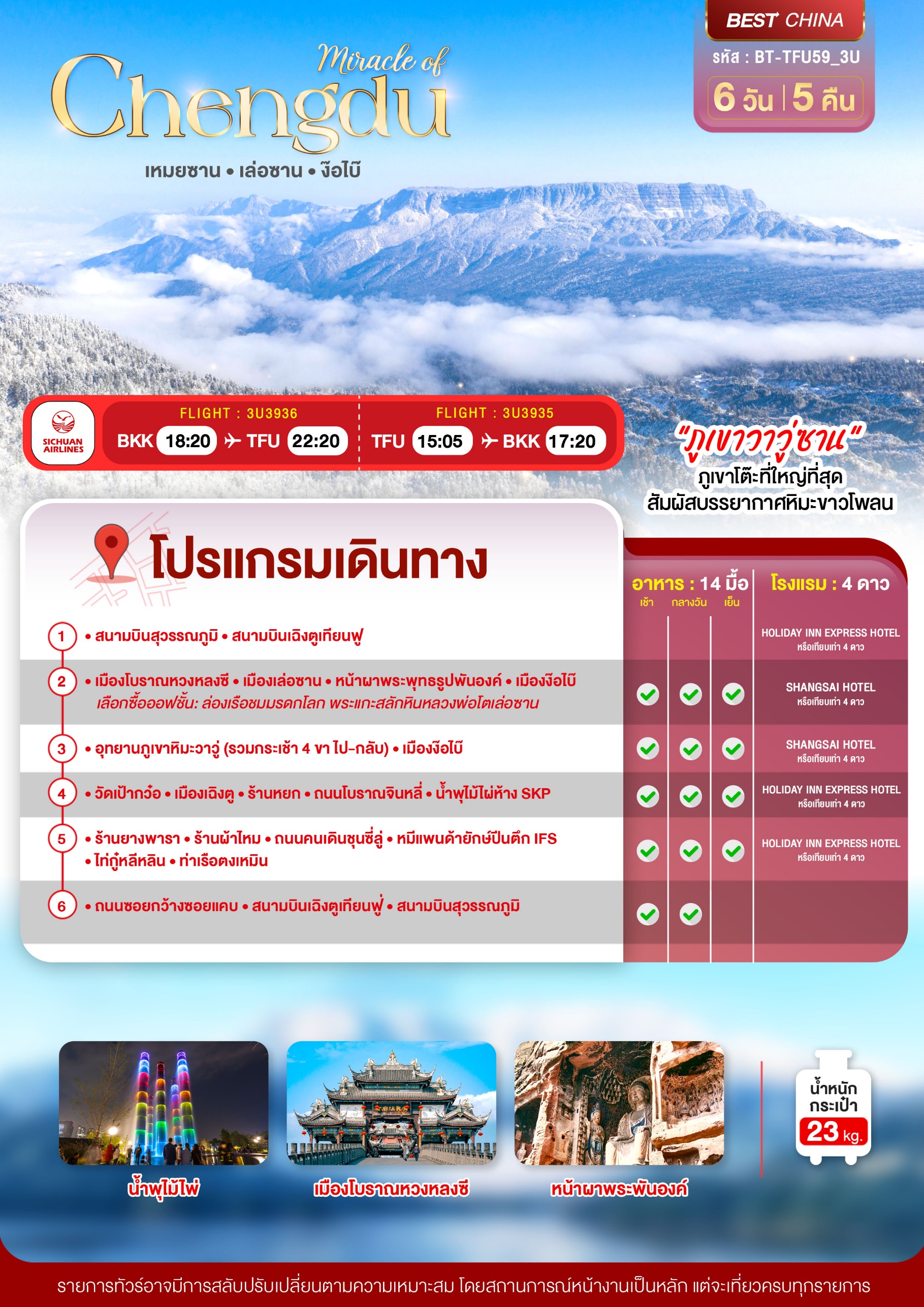 ทัร์จีน เฉิงตู ภูเขาหิมะวาวู่ เล่อซาน ง๊อไบ๊ 6 วัน 5 คืน บิน3U เดินทาง ม.ค.-มี.ค. 69 ราคาเริ่ม 17,999 บาท