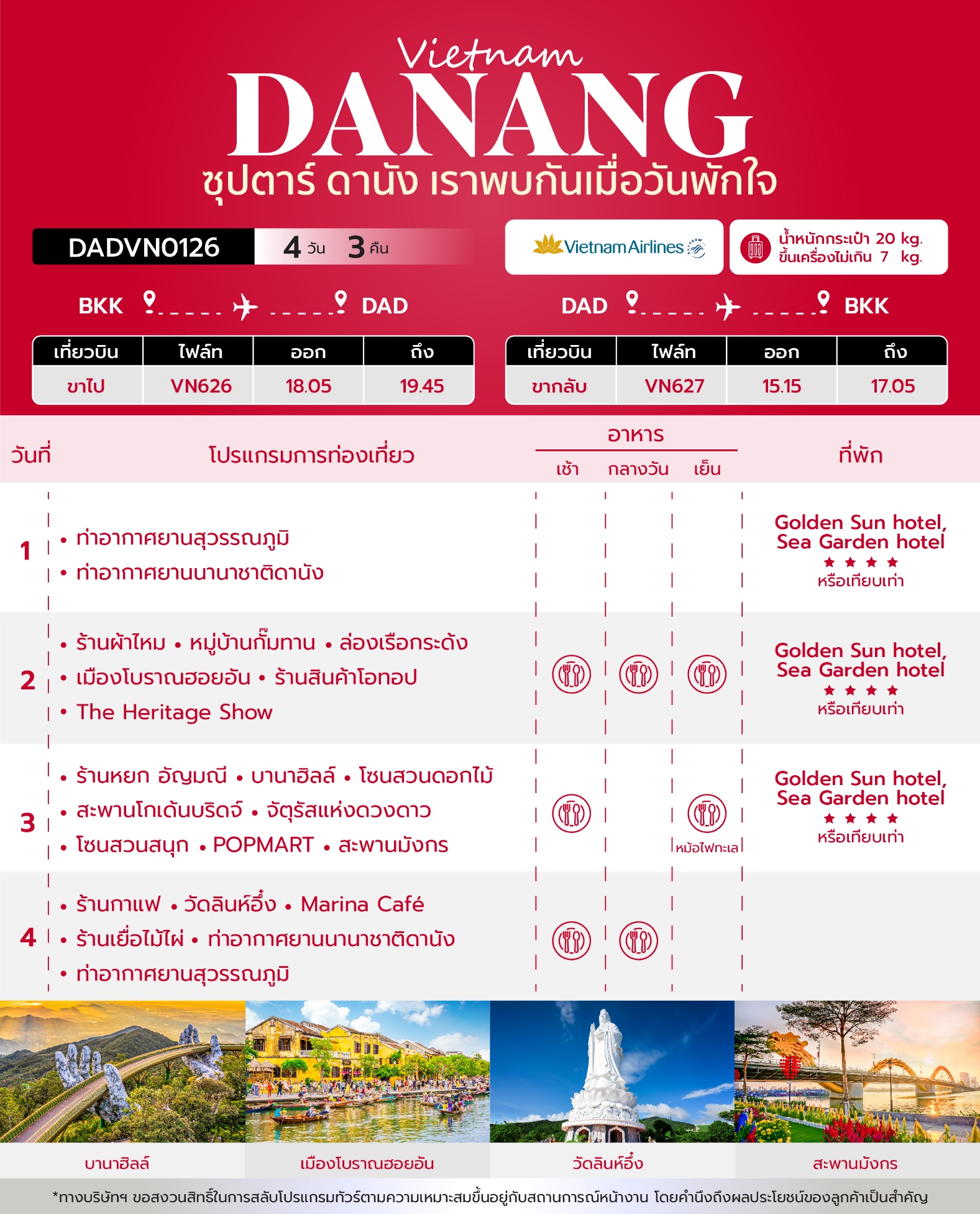 ซุปตาร์...ดานัง เราพบกันเมื่อวันพักใจ 4 วัน 3 คืน (APR - SEP 26) บินเย็น-กลับเย็น(ไม่นอนบานาฮิลล์)