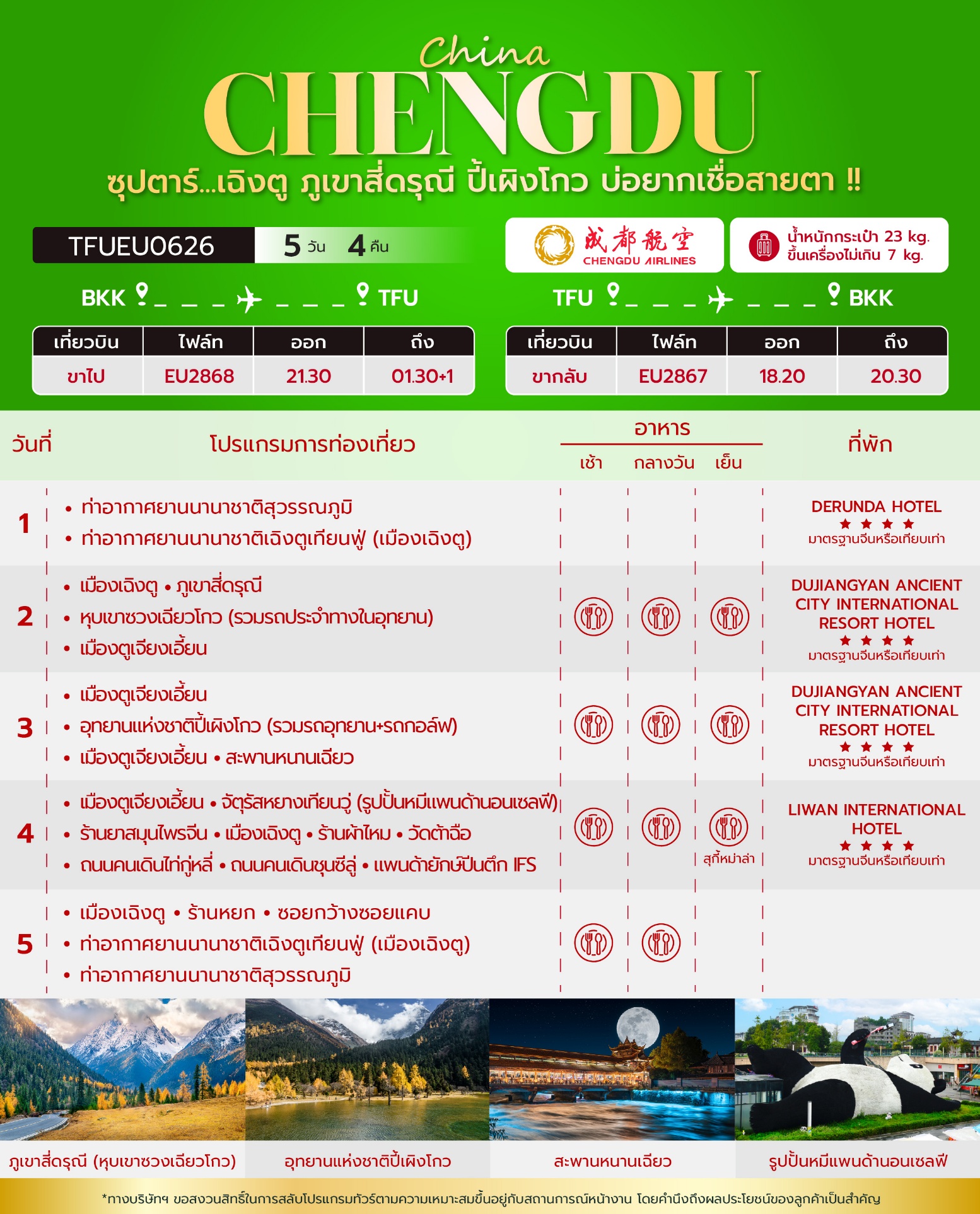 ซุปตาร์...เฉิงตู ภูเขาสี่ดรุณี ปี้เผิงโกว บ่อยากเชื่อสายตา 5 วัน 4 คืน (APR - OCT 26) บินดึก-กลับค่ำ